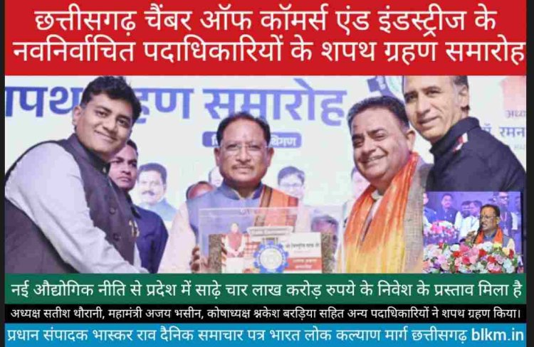 मुख्यमंत्री श्री विष्णु देव साय ने राजधानी रायपुर के शहीद स्मारक ऑडिटोरियम में आयोजित छत्तीसगढ़ चैंबर ऑफ कॉमर्स एंड इंडस्ट्रीज के शपथ ग्रहण समारोह को संबोधित करते हुए यह बात कही। कार्यक्रम में चैंबर के अध्यक्ष श्री सतीश थौरानी, महामंत्री श्री अजय भसीन, कोषाध्यक्ष श्री निकेश बरड़िया सहित अन्य पदाधिकारियों ने शपथ ग्रहण किया।
