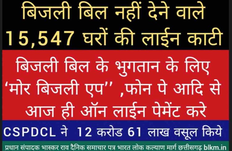 छत्तीसगढ़ स्टेट पॉवर डिस्ट्रीब्यूषन कंपनी लिमिटेड, दुर्ग क्षेत्र के मुख्य अभियंता ने उपभोक्ताओं से अपील करते हुए कहा कि नियत समय पर बिजली बिल का भुगतान करें एवं विद्युत विच्छेदन की कार्यवाही से बचें। उन्होंने उपभोक्ताओं से कहा कि बिजली बिल जमा करने में विलंब ना करें। इससे ना केवल विभागीय कार्यों में असर पड़ता है, बल्कि क्षेत्र के विद्युतीय विकास कार्यों में भी बाधा पहुंचती है।