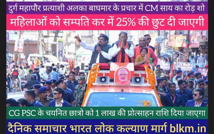 दुर्ग महापौर प्रत्याशी अलका बाघमार के प्रचार में आयोजित रोड़ में CM साय बोले महिलाओं को सम्पति कर में 25% की छुट दी जाएगी. 18 लाख PM आवास बनाए जा रहे हैं