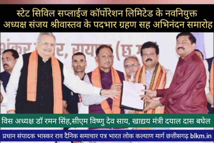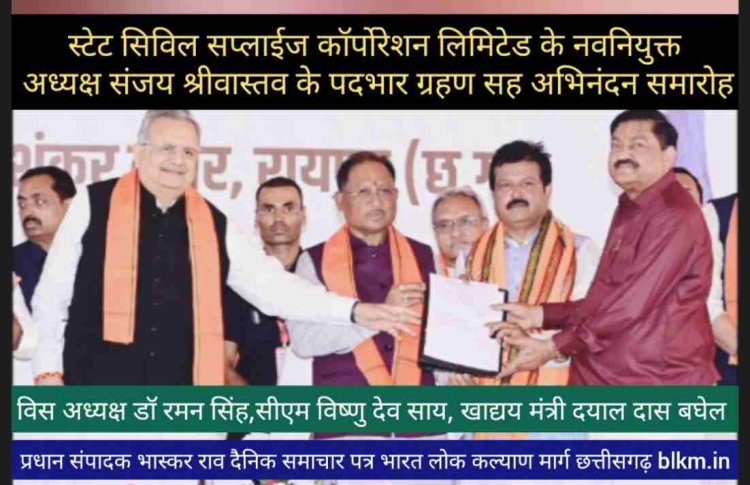 रायपुर, 16 अप्रैल 2025/ मुख्यमंत्री श्री विष्णु देव साय आज राजधानी रायपुर के शंकर नगर स्थित बीटीआई ग्राउंड में छत्तीसगढ़ स्टेट सिविल सप्लाईज कॉर्पाेरेशन लिमिटेड के नवनियुक्त अध्यक्ष श्री संजय श्रीवास्तव के पदभार ग्रहण एवं अभिनंदन समारोह में शामिल हुए। मुख्यमंत्री श्री साय ने छत्तीसगढ़ स्टेट सिविल सप्लाईज कॉर्पाेरेशन लिमिटेड के नवनियुक्त अध्यक्ष श्री संजय श्रीवास्तव को पदभार ग्रहण करने पर बधाई एवं शुभकामनाएं दी।